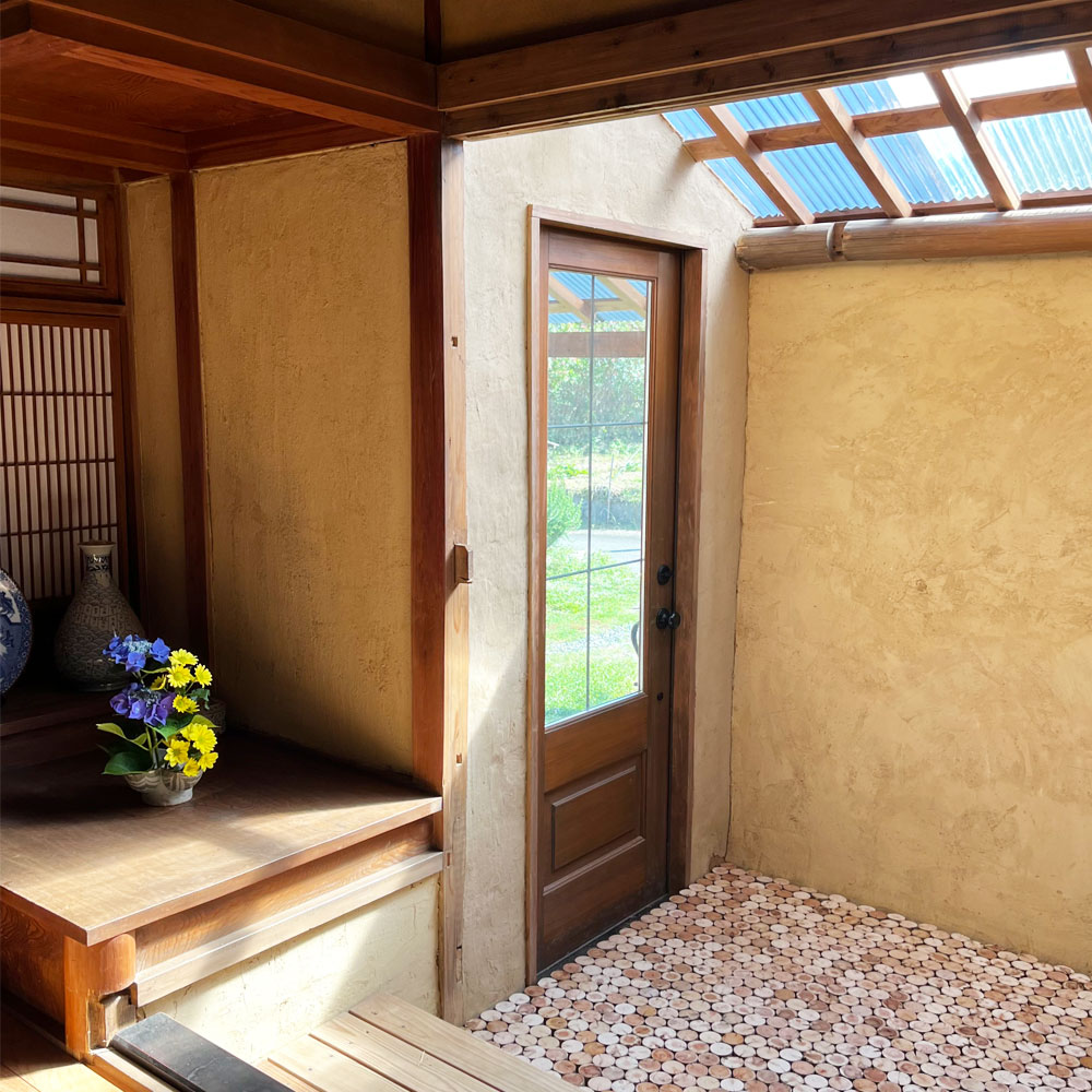 まず目に入るのは、木と土壁のやわらかなコントラスト。そこにウッドデポのドアが静かに溶け込んでいて、まるで最初からこの家の一部だったかのようです。