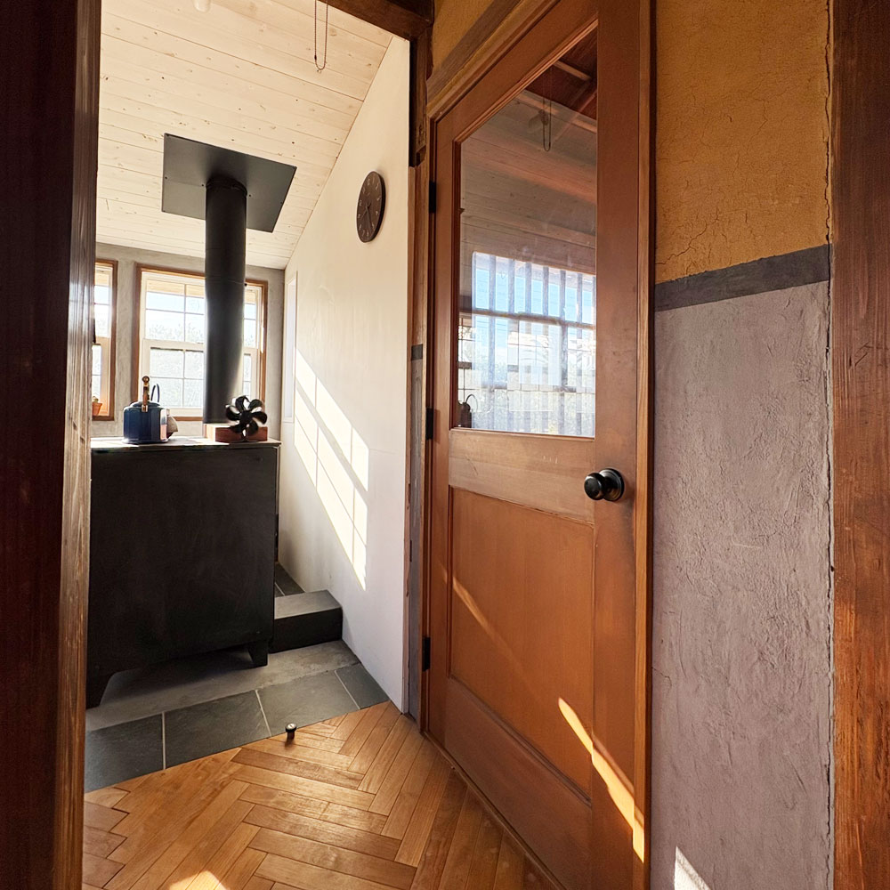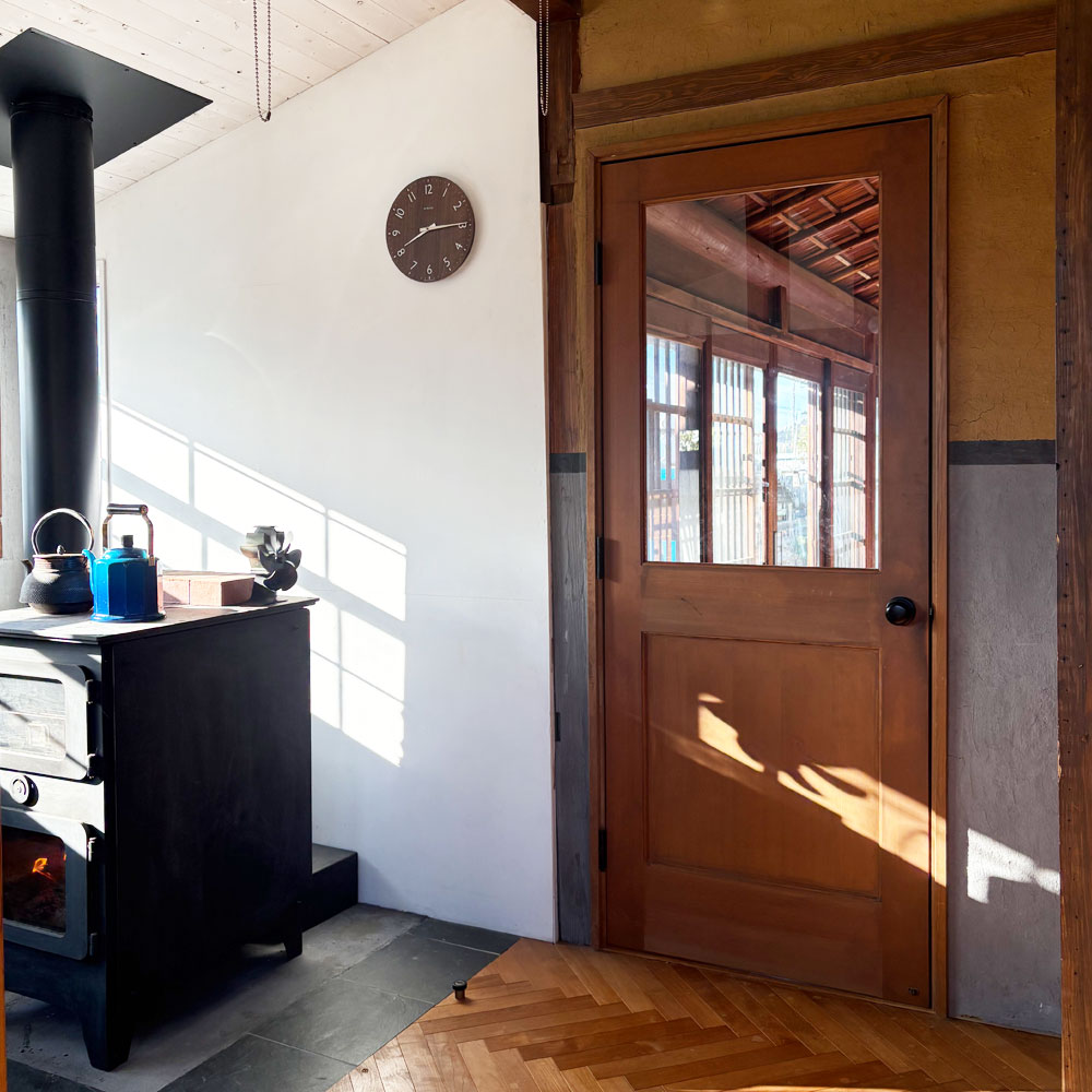 お客様の手で少しずつ息を吹き返したこの家。季節の光が差し込み、薪ストーブの煙がゆらめくその景色の中で、木製ドアがまるで“家族の一員”のように佇んでいました。
