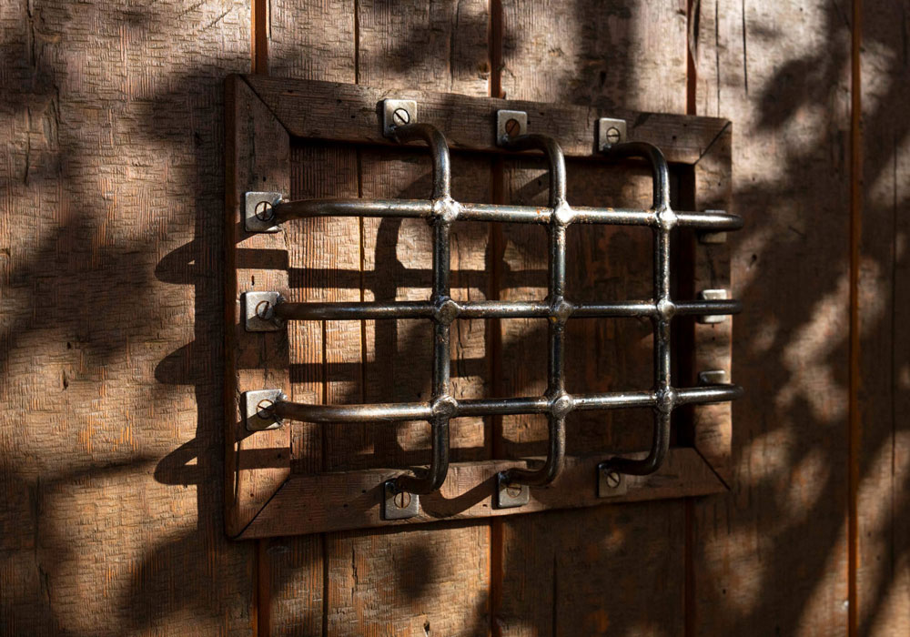 夕方、日が傾き始めると、木製ドアに落ちる葉の影。