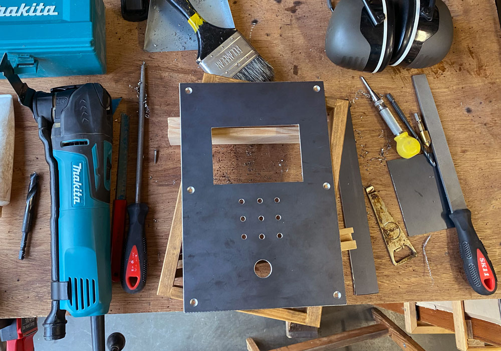 木枠で整え、鉄板で表情をつけ、マイナスビスで仕上げるという作戦を選びました。
