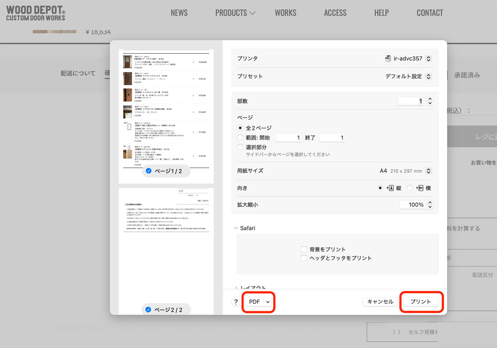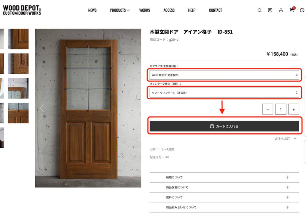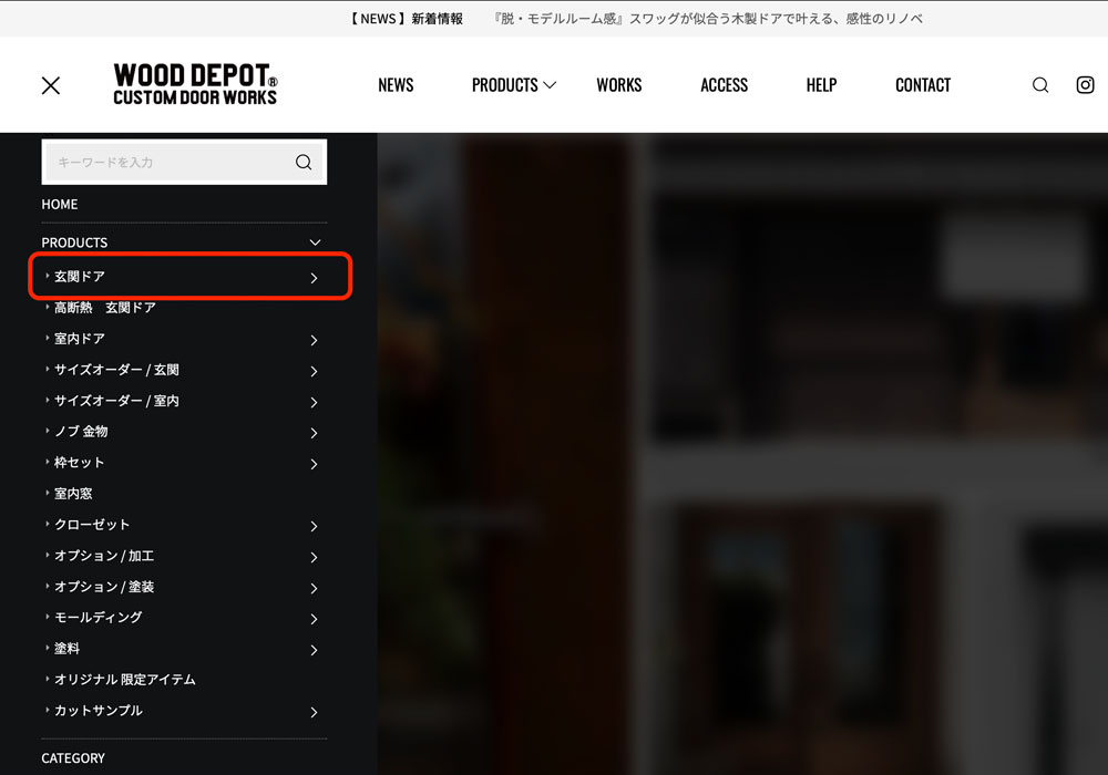 まずは、見積もりをしたい木製玄関ドアの商品ページにたどり着くまでのナビゲーションです。