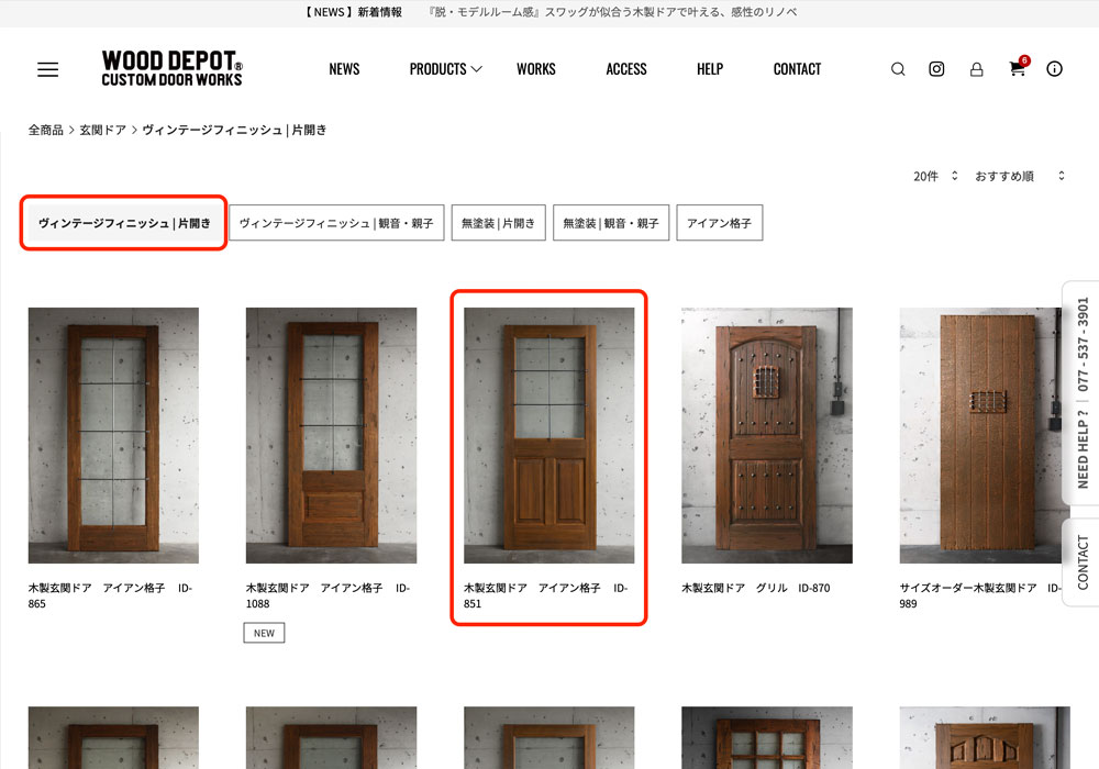 商品特定:絞り込まれた商品の中から、ご希望のドアである「木製玄関ドア アイアン格子 ID 851」を探し、クリックして商品詳細ページを開きます。