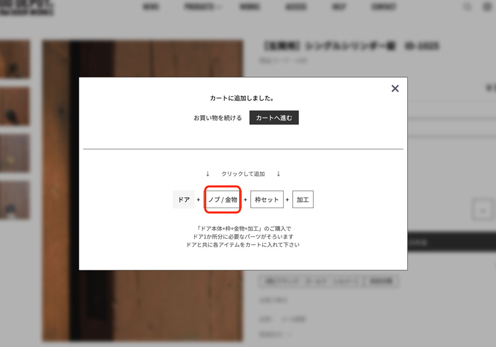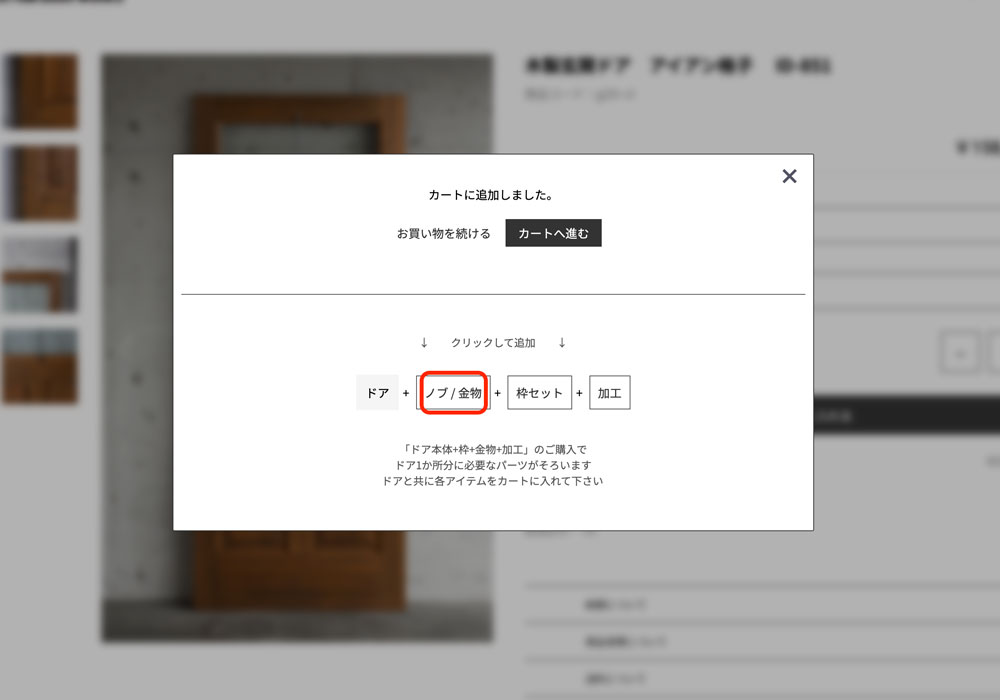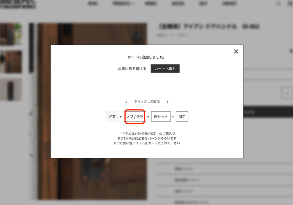 「アイアンドアハンドル ID-862」をカートに入れるとポップアップ画面が出て白い枠内の「ノブ/金物」クリックをします。