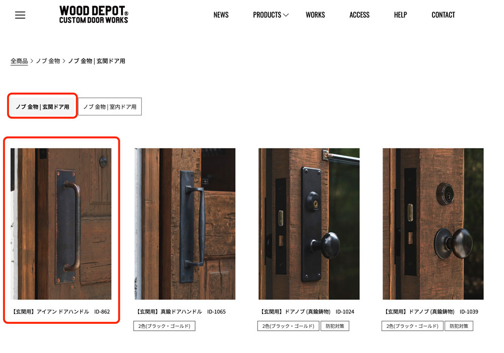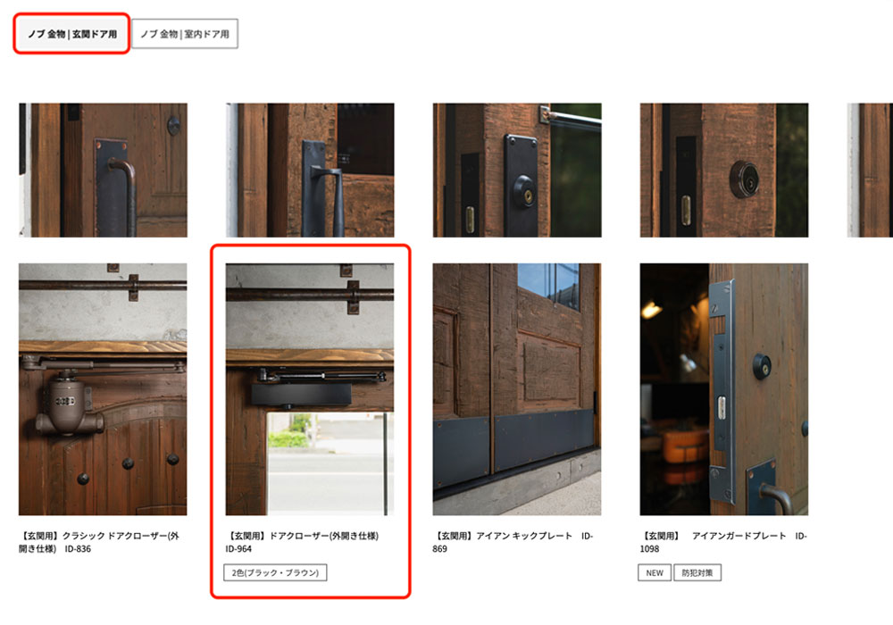 絞り込み:商品一覧画面の左上にある絞り込みメニューで、一番左側のバナーから「ノブ金物|玄関ドア用」を選択し、表示を絞り込みます。