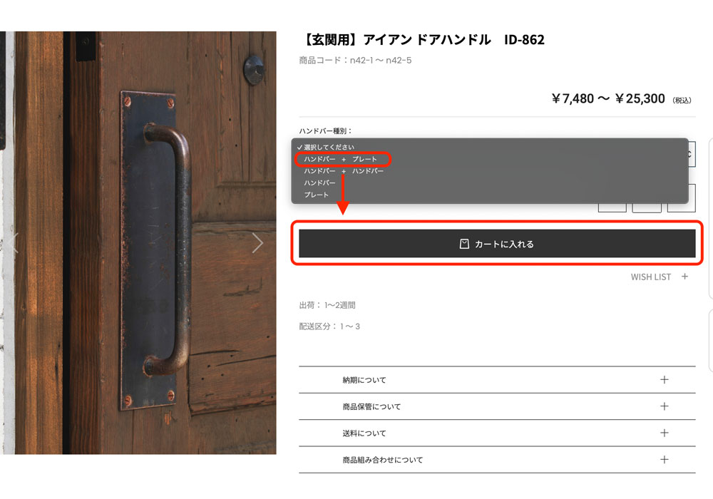商品特定:絞り込まれた商品の中から、ご希望のドアである「アイアンドアハンドル ID-862」を選び、クリックして商品詳細ページを開きます。
