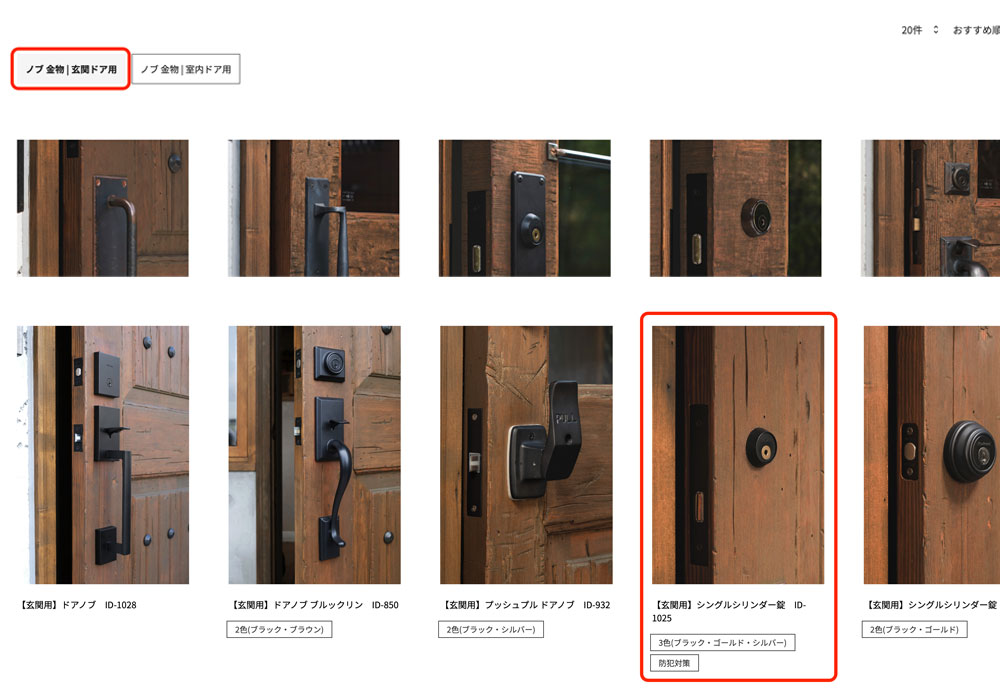 商品特定:絞り込まれた商品の中から、ご希望のドアである「シングルシリンダー錠 ID-1025」を選び、クリックして商品詳細ページを開きます。