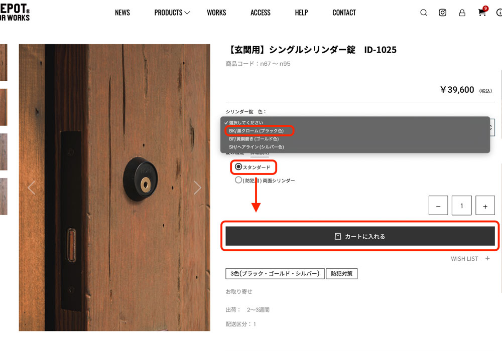 「シングルシリンダー錠 ID-1025」をカートに入れるとポップアップ画面が出て白い枠内の「ノブ/金物」クリックをします。