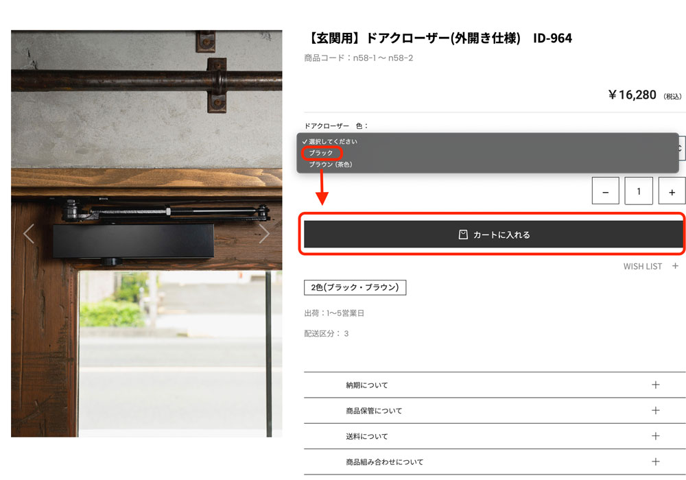 商品特定:絞り込まれた商品の中から、ご希望のドアである「【玄関用】ドアクローザー ID-964」を選び、クリックして商品詳細ページを開きます。