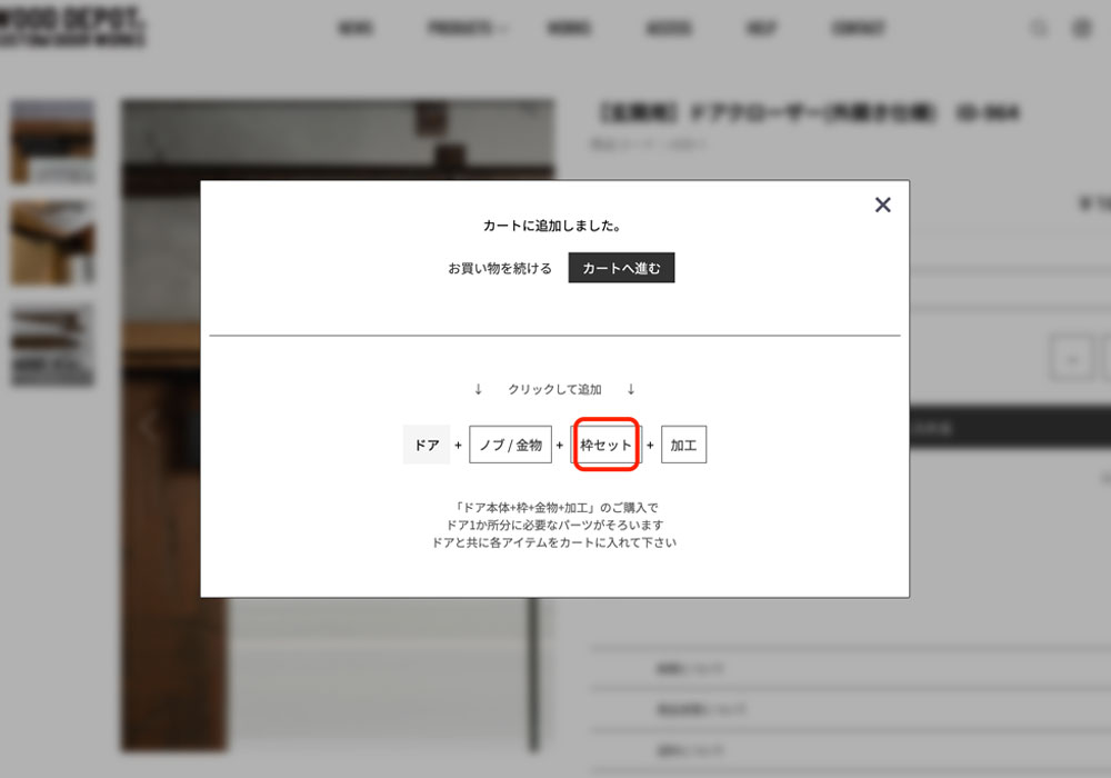 「【玄関用】ドアクローザー(外開き仕様) ID-964」をカートに入れるとポップアップ画面が出て白い枠内の「枠セット」クリックをします。