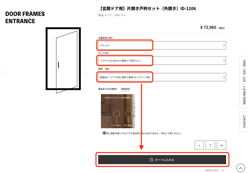 商品詳細ページでは、ドア本体のドアサイズと仕上げを決めます。
