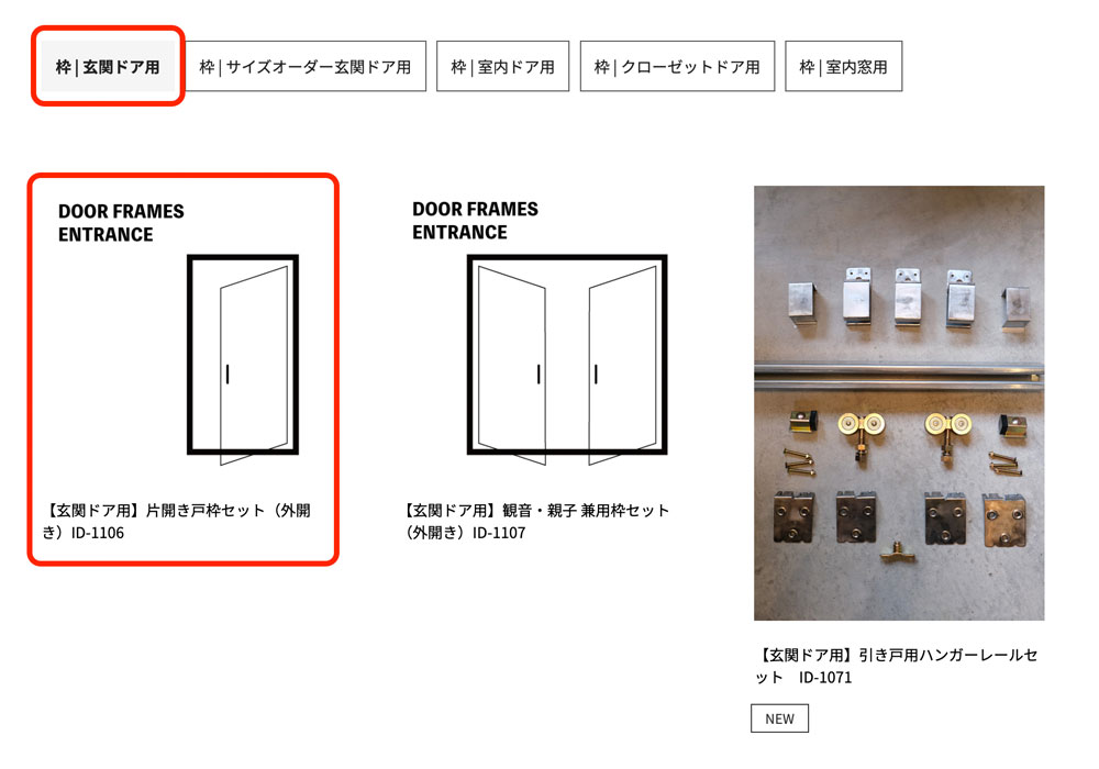 商品特定:絞り込まれた商品の中から、ご希望のドアである「【玄関ドア用】片開き戸枠セット(外開き)ID-1106」を選び、クリックして商品詳細ページを開きます。