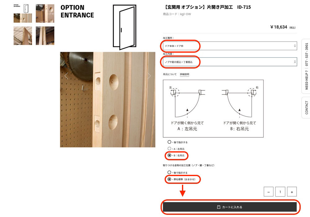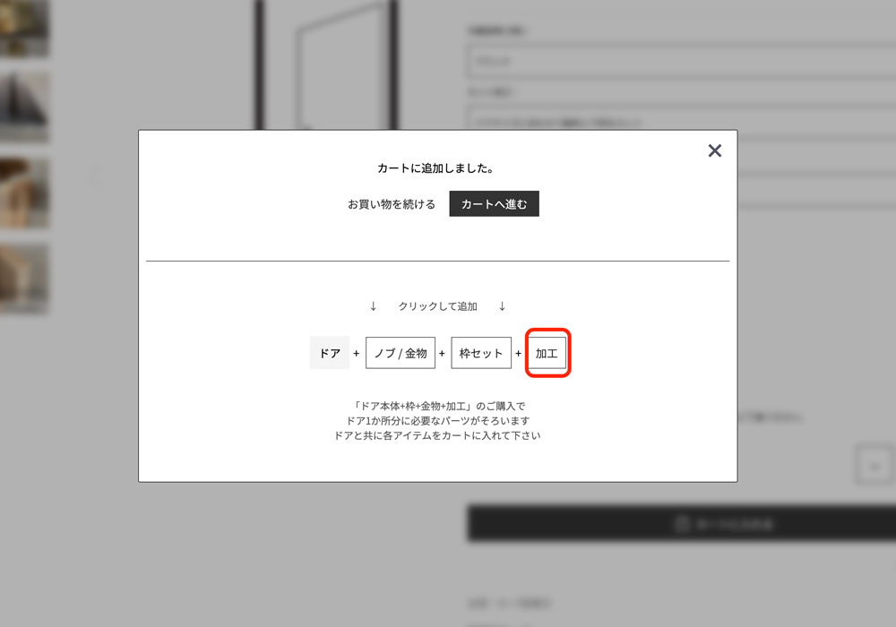 「【玄関ドア用】片開き戸枠セット(外開き)ID-1106」をカートに入れるとポップアップ画面が出て白い枠内の「加工」クリックをします。