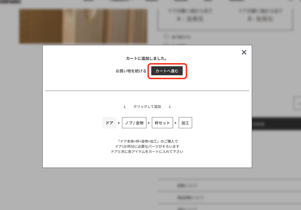 「玄関ドア用オプション片開きの加工 ID 715」をカートに入れるとポップアップ画面が出て白い枠内の「カートへ進む」クリックをします。