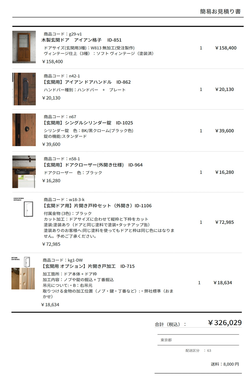 このガイドでは、ウェブサイトの簡易見積もりシミュレーションを使って、玄関ドア本体からノブ金物類、枠セット、加工オプション、送料まで含めた施工に必要な全てのパーツが揃った合計金額を簡単にご自身でお見積でき、確認していただける手順をご案内いたします。(PC版)
