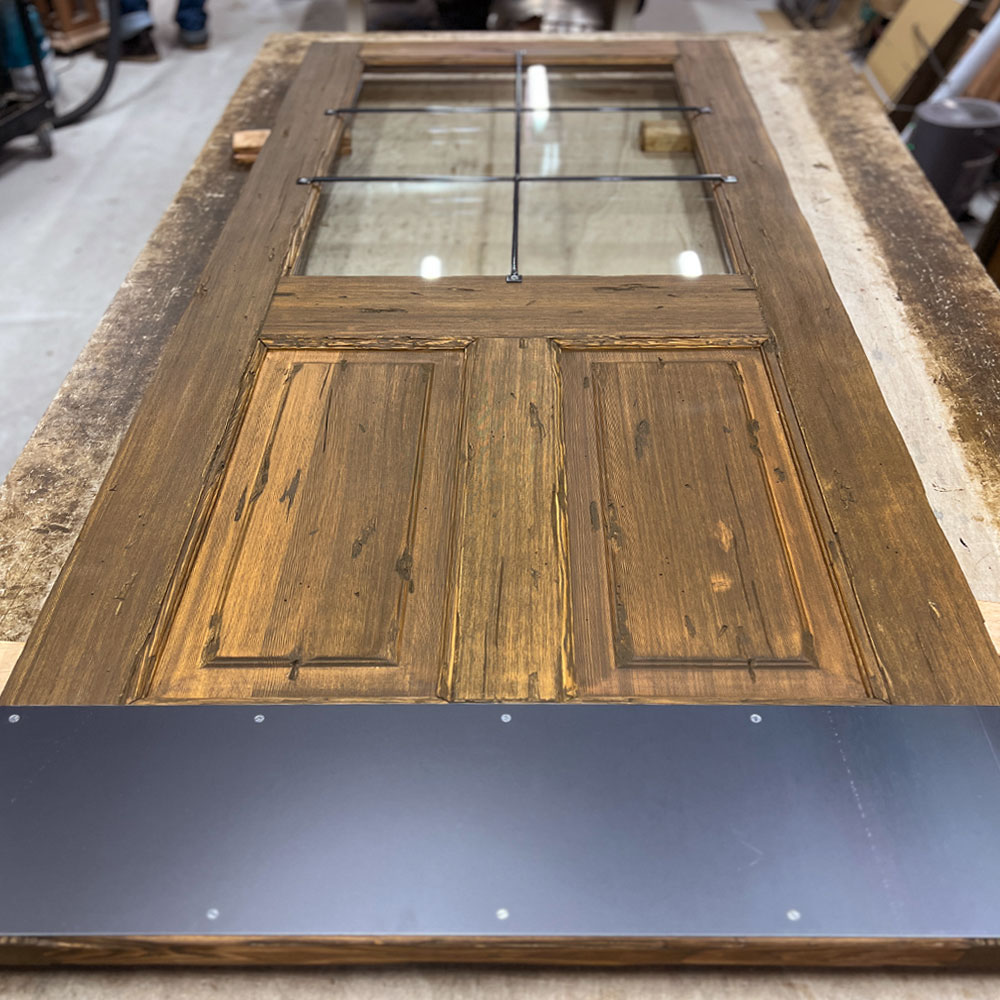 (マットな質感が木材の温かみを引き立てる、重厚なキックプレート)