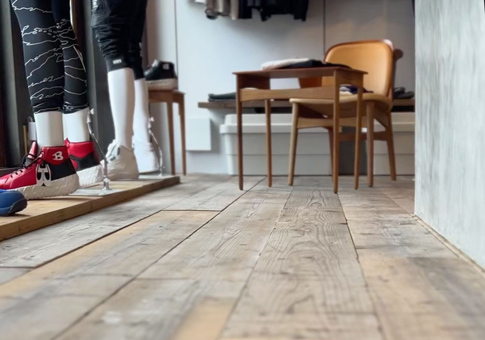 エシカルな仕掛け: 店舗の塗り壁材の一部には、ジーンズの廃材などの廃棄素材を活用したエシカル建材が使われています。視覚的な美しさだけでなく、遊び心も感じられる工夫です。
