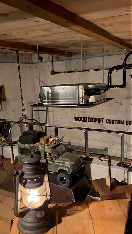 そして今回のハイライトが、この秘密基地の中央にどっしりと陣取る一台。その名も「WOOD DEPOT CUSTOM DOOR WORKS号(ミニサイズ)」。