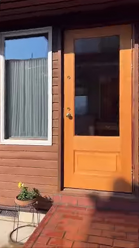 家に向かって歩くと、木の外壁と、鮮やかな色味の木製玄関ドアが陽に照らされていて、