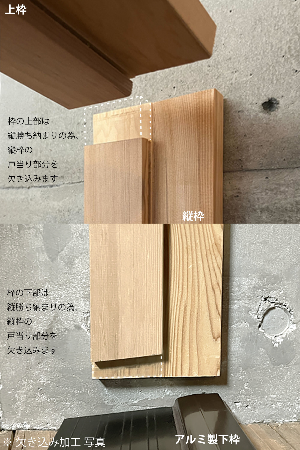 | 詳細 | カット・欠き込み有り(横枠は切りっぱなし) 加工箇所 : 縦枠 上下 ![]() ![]() |